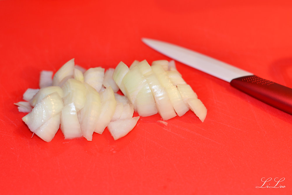 Faire chauffer un peu d’huile d’olive dans une poêle et y ajouter les oignons, laisser cuire à feu moyen jusqu’à ce qu’ils deviennent un peu transparents. Je rajoute un peu d’eau lorsque les oignons sont transparents, cela leurs donne une autre texture que j’aime beaucoup. Une fois les oignons cuits, je les mets dans un bol pour ne pas les faire trop cuire lors de la cuisson des boulettes.